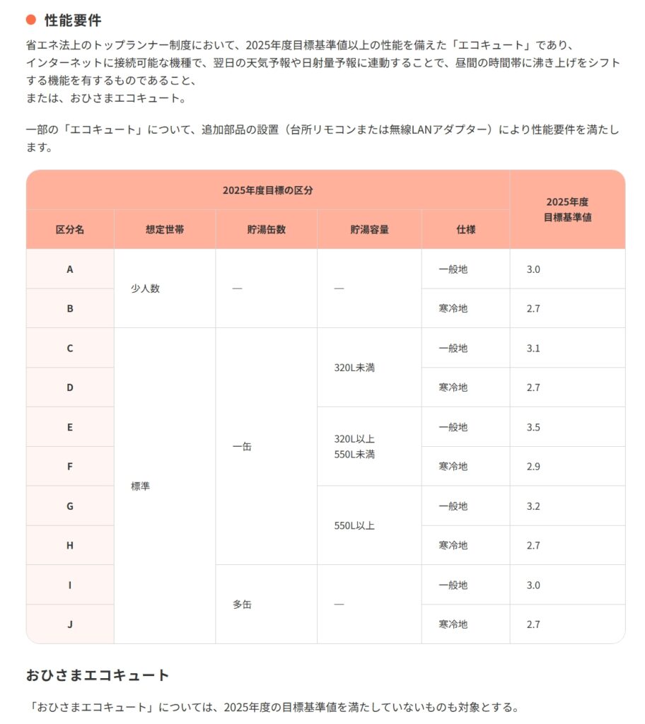 昨年は性能加算要件となっていた【インターネットに接続可能な機種で、翌日の天気予報や日射量予報に連動することで、昼間の時間帯に沸き上げをシフトする機能を有するもの】という条件が、給湯省エネ2026では基本的な対象要件となりました。