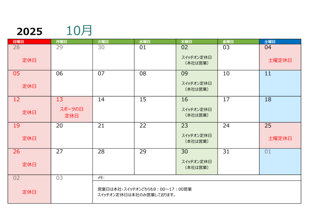 - 2025.09.26 お知らせ 2025年10月休業日のお知らせ