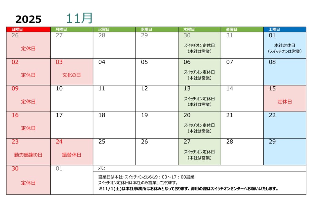 - 2025.10.31 お知らせ 2025年11月休業日のお知らせ