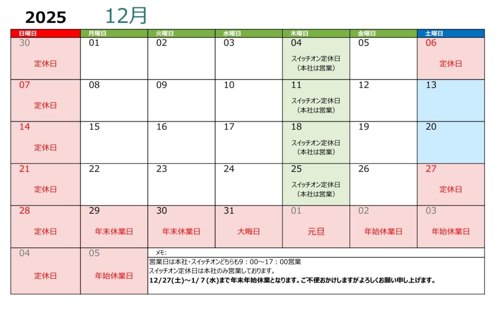 - 2025.12.12 お知らせ 2025年12月休業日・年末年始休業日のお知らせ