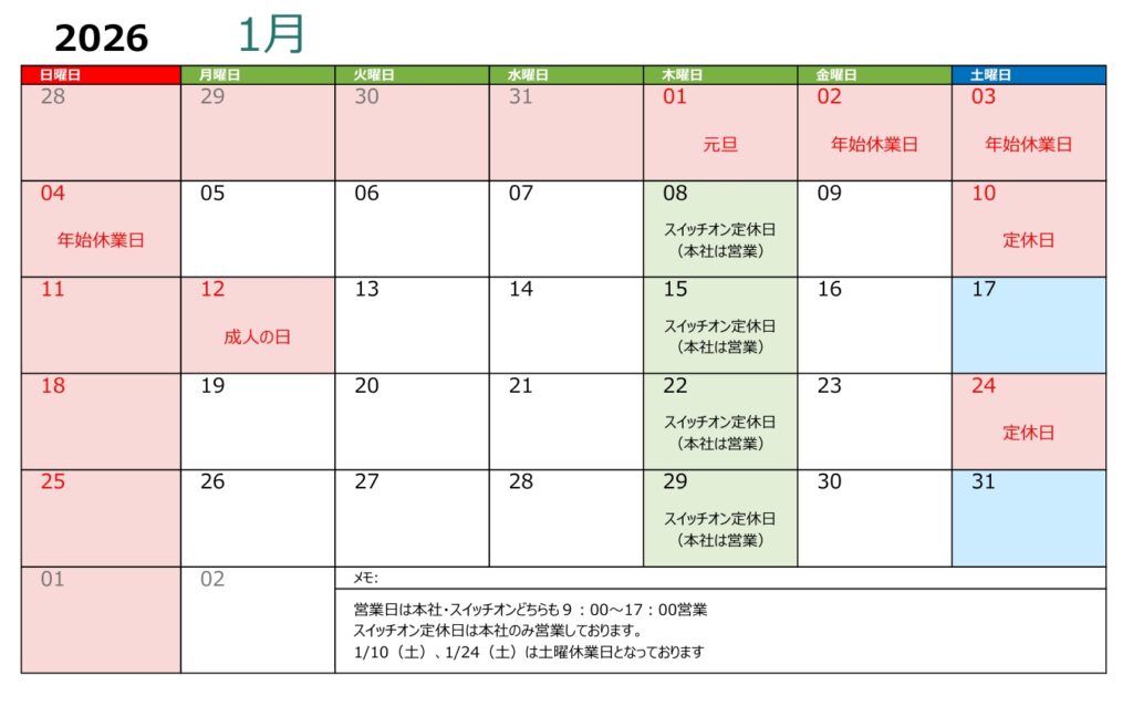 2026年1月休業日のお知らせ